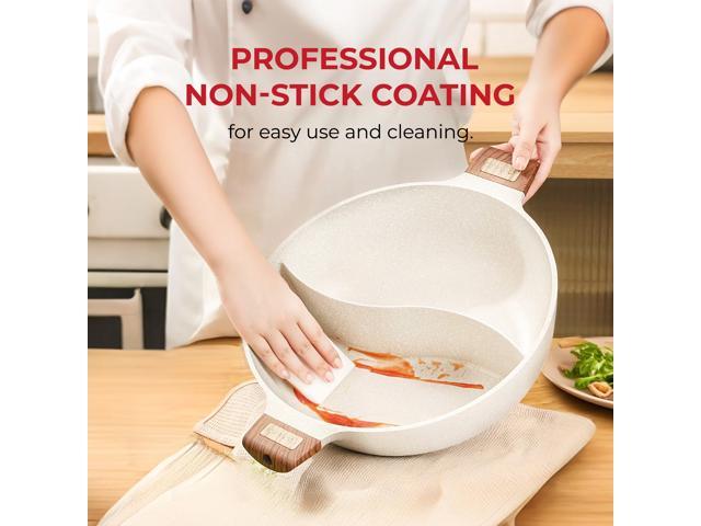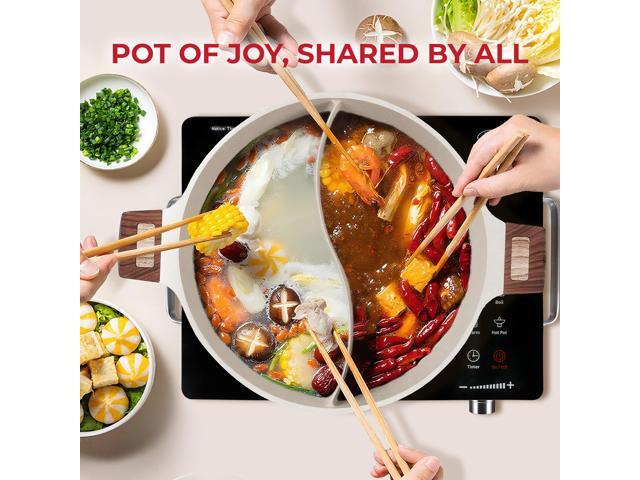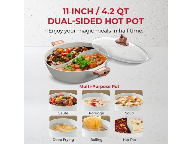 • Dual Flavors in One Pot - This 100% PFOA & PFAS-free divided hot pot lets you enjoy both spicy and mild broths simultaneously, catering to different taste preferences in a single meal - perfect for cutting your cooking time in half.